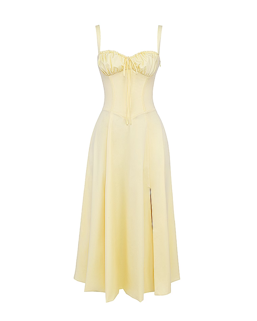Você se sentirá ultrafeminina em nosso vestido 'Aurora', perfeito para festas no jardim na primavera e no verão. Confeccionado em algodão elástico na linda cor amarelo-manteiga, possui corpete estruturado para acinturar a silhueta e um belo fechamento em cadarço nas costas. O busto franzido tem um cordão para ajuste e a fenda lateral adiciona um toque de sensualidade, revelando um pouco das pernas.