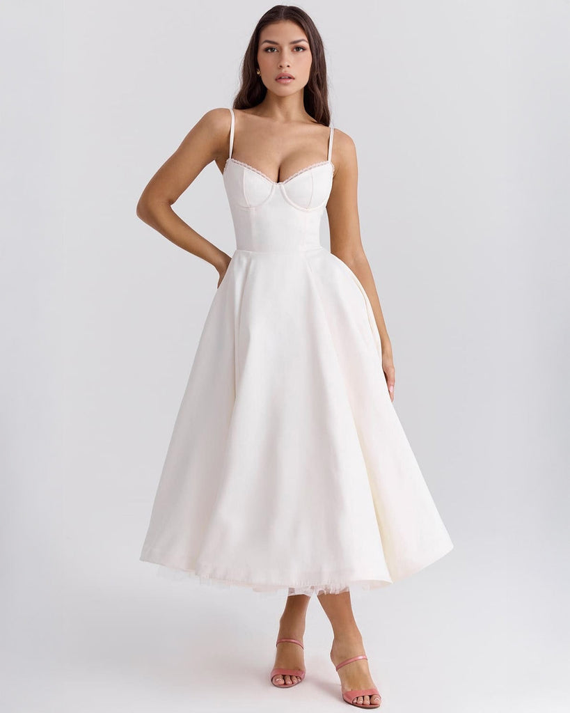 Com um toque de power mesh, nosso vestido midi 'Selene' é a personificação dos contos de fadas. O corpete é perfeitamente estruturado com barbatanas para acinturar a cintura e possui um lindo decote coração com bojos com aro. As alças delicadas são ajustáveis para um caimento perfeito, e o destaque do 'Selene' é a saia midi fluida, com uma camada volumosa do tule mais macio para um visual deslumbrante que mantém a forma com perfeição.