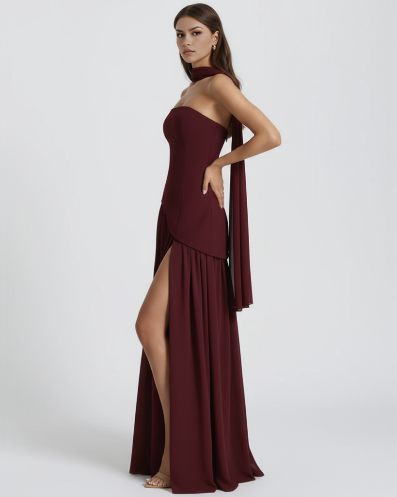 Você vai se apaixonar pela elegância atemporal do nosso vestido longo Serena em um tom profundo de cereja laqueado. Confeccionado em luxuoso crepe, este vestido apresenta um corpete estruturado com delicados detalhes de amarração nas costas, criando uma silhueta esculpida em formato de ampulheta. A cintura assimétrica drapeada valoriza todas as curvas, enquanto a saia ampla de chiffon com pregas flui graciosamente a cada passo. Um lenço delicado combinando adiciona um toque de feminilidade refinada, completando este look gracioso, criado para cativar em todos os ângulos.