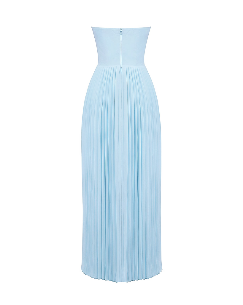 A beleza etérea e oceânica de 'Siena' cria uma atmosfera onírica e romântica. Confeccionado em georgette azul-marinho, o busto apresenta pregas em formato de concha que definem lindamente o decote. O corpete é perfeitamente estruturado com barbatanas para acentuar a cintura. A saia maxi plissada flui com elegância, garantindo que cada passo seja verdadeiramente fascinante. Use o seu em eventos de verão e jantares românticos.